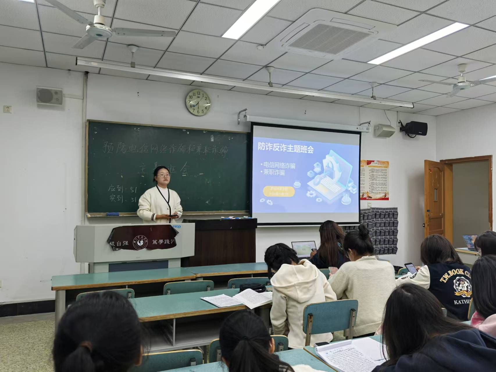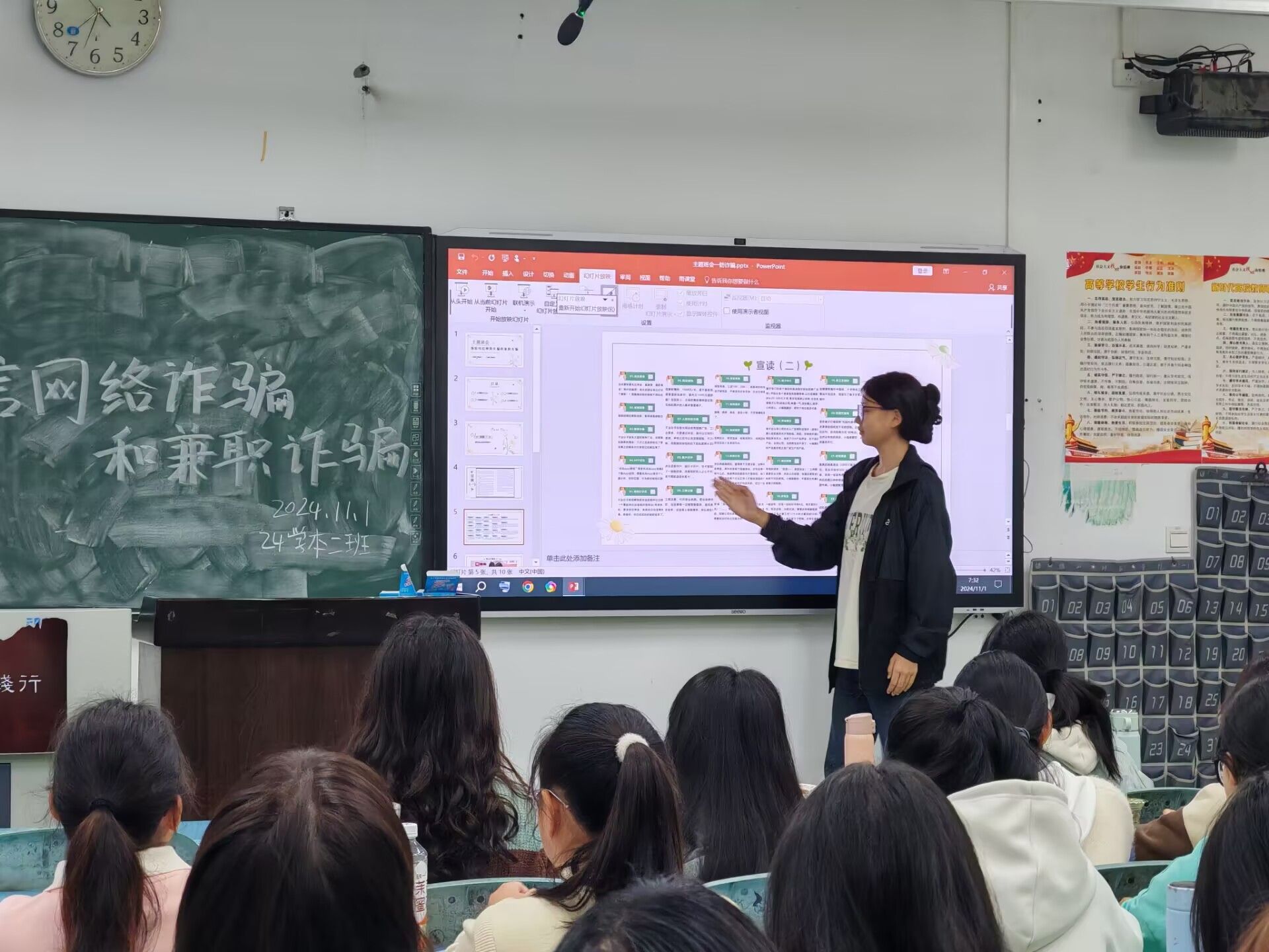 本网讯(图、文/高一丹)11月4-5日,为有效防范电信网络诈骗,提高同学们的防范意识,教育科学学院组织2024级各班开展以“预防电信网络诈骗和兼职诈骗”为主题的班会活动。