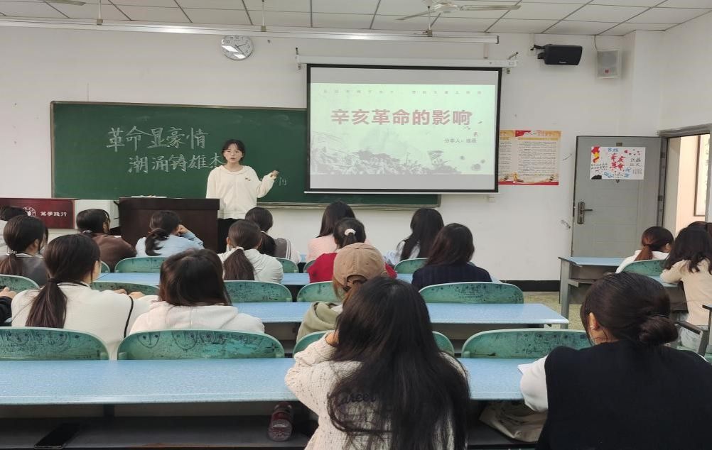 本次活动以红色人物图片和辛亥革命相关视频展示拉开序幕。随后,三位入党积极分子以PPT的形式分别从历史背景、革命中的青年人和革命影响三个方面向大家分享辛亥革命的故事,带领同学们一起感受先辈们的爱国热忱和高尚的革命精神。最后,主持人根据分享内容随机提问,让同学们在思考问题中更好地领悟辛亥革命的历史意义,同学们踊跃发言,表达不同的观点和感想。