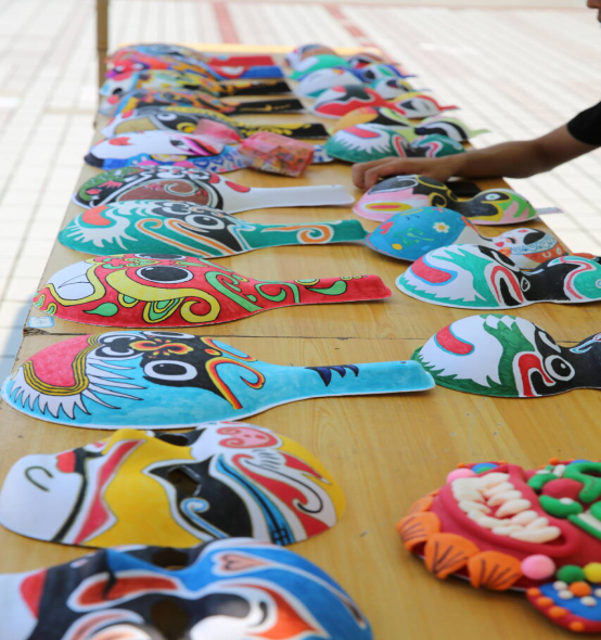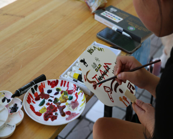 在书法体验区,同学们在学生志愿者的耐心指导下,提笔在斗方彩笺上书写名言佳句。他们神情专注,一笔一划都饱含着对书法艺术的热爱与敬畏。有的同学书写着古诗词,感受着古人笔下的诗意与情怀;有的同学则写下励志的话语,激励自己在未来的道路上勇往直前。墨香在空气中弥漫,笔墨韵味在彩笺上尽情展现。而在团扇创作区,更是热闹非凡。同学们手持画笔,在素雅的团扇上尽情挥洒创意。现场还有装饰精美的花朵、形态各异的面具等手工艺品展示,进一步增添了艺术氛围。同学们沉浸在传统绘画的乐趣中,欢声笑语不断。