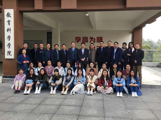 本网讯(文、图/廖思宇)2019年4月4日下午,教育科学学院在学院会议室举行了“阳初文化·乐教”卓越小学教师培养工作坊开班典礼。教务处副处长罗明礼,教科学院主持工作副院长谢艺泉、党总支书记杨霞等管理人员、乐山市部分小学校长和国家“万人计划”教学名师程远友以及卓越小学教师培养工作坊的指导老师和同学们出席了本次开班典礼。会议由教科学院分管教学副院长廖华平主持。