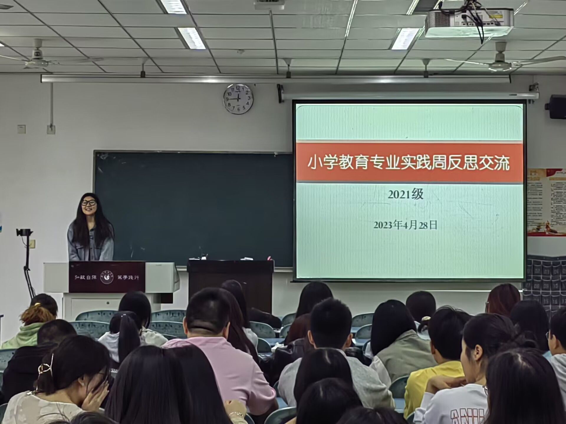 本网讯(文图/罗清)为了提高小学教育专业实践周见习实效,4月28日,在行知楼114和210教师分别开展了2021级、2022级小学教育专业实践周见习反思交流活动。小学教育专业部分老师及小学教育专业2021级和2022级全体学生参加了活动。