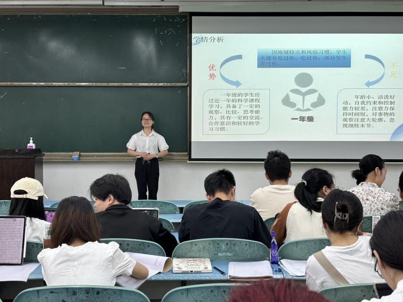 本网讯(文图/杨鑫)为教育科学学院于5月31日在行知楼举办科学教育专业师范生教学技能大赛。来自2022级、2021级科学教育专业27名同学参加此次比赛,每人有8-15分钟的片段教学时间,各参赛人员灵活运用教学方法和手段,在规定时间内去展示片段教学,确保每位学生都能够积极参与到课堂中。