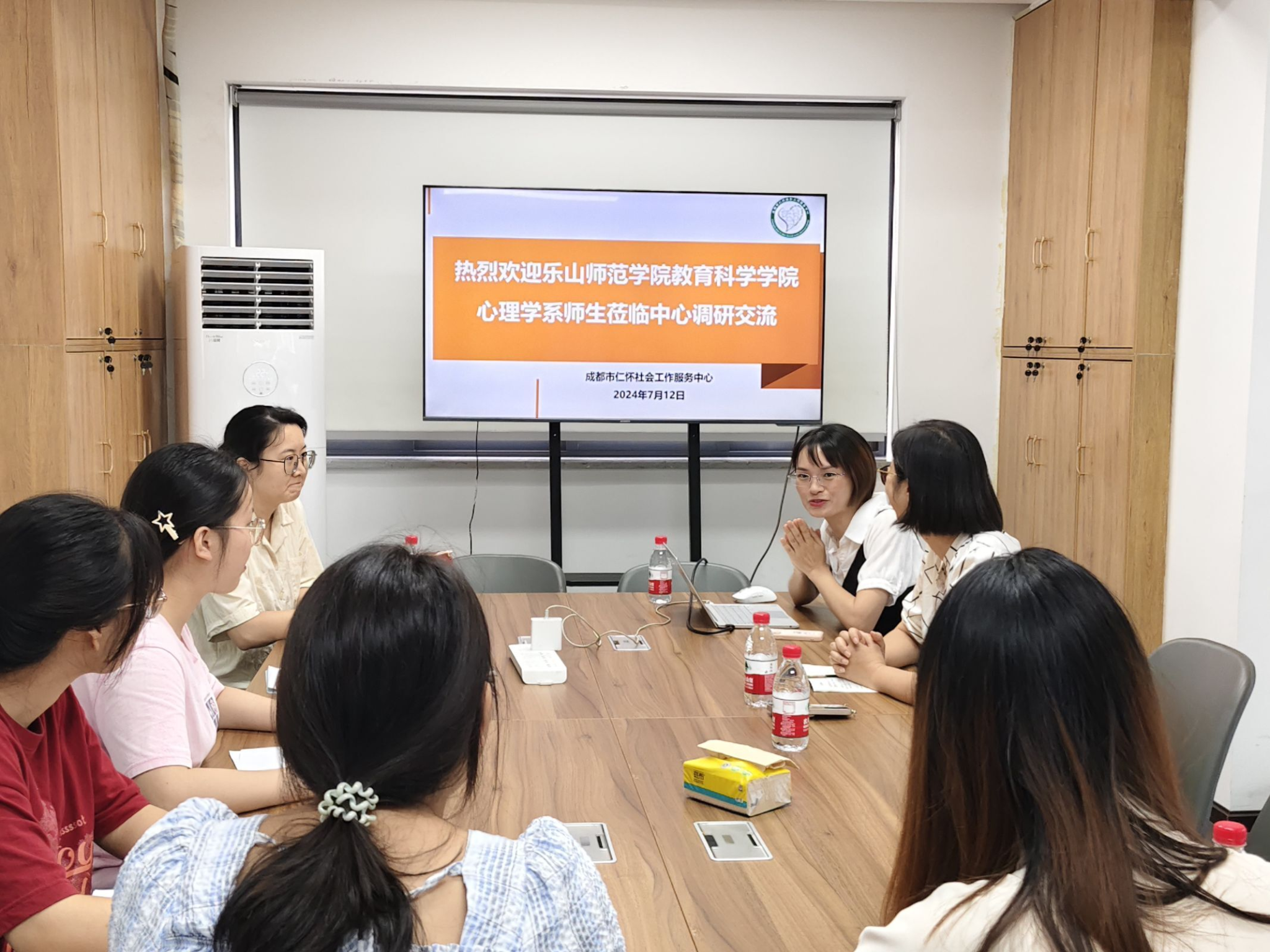 在调研访谈时,仁怀机构中心理事长冉启浩老师就中心的社工服务和社会心理服务工作概况进行交流。中心督导张琴老师详细介绍近年来中心按照"立足服务场景,坚持专业支撑、回应重点需求"的社会心理服务路径,在街道、学校、医院、社区、关爱援助站(室)等多个服务场景,建立跨专业跨学科跨领域的服务队伍,开展多元化、专业化、系统化的社会心理服务实践及研究工作。同时仁怀中心还邀请成都五四三机构的张惠敏老师做社会心理服务交流,共同研讨社会心理服务机构参与大学生心理健康工作的联动机制、服务路径、具体内容及形式等。