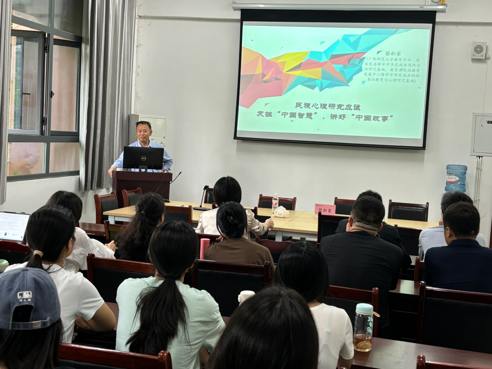 本网讯(图、文 /滕冬冬)2025年5月15日,中国人民大学二级教授、广西师范大学特聘教授、博士生导师张积家教授受邀到我校为教育科学学院全体师生作题为《民族心理研究要发掘中国智慧,讲好中国故事》的学术讲座,由教育科学学院副院长马艺丹主持,学院师生参加了此次讲座。