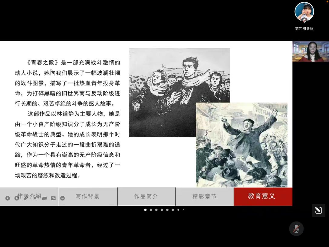 活动伊始,各组按照抽签顺序分享红色书籍,共同围绕写作背景、内容简介、人物特点、书籍点评等方面对红色经典书籍进行讨论,分享小组内的理解和感悟。其中第一组对《红岩》进行分享,让同学们更加了解战争和革命,更明白黑暗需要人们用光明,用信仰去驱散;第三组通过对《保卫延安》的分享,提出要珍惜来之不易的和平生活,要在党的领导下为建设更加美好的祖国而自强不息;第五组分享的《青春之歌》告诉同学们要积极奋斗,莫负青春。