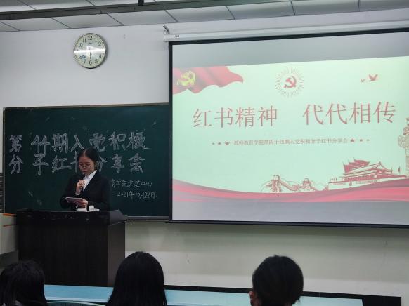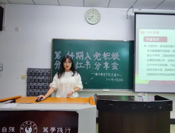 本网讯(文、图/曹飞菲、母鑫苑)为深入落实党史学习教育,分享红色书籍,弘扬忠诚履职、担当作为的革命精神。教师教育学院于10月29日在行知楼313教室开展了第44期入党积极分子红书分享会。参与本次分享会的为四十四期全体入党积极分子。本次活动由贾悦主持。