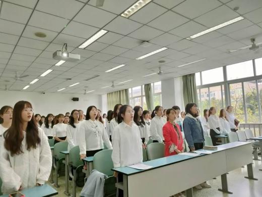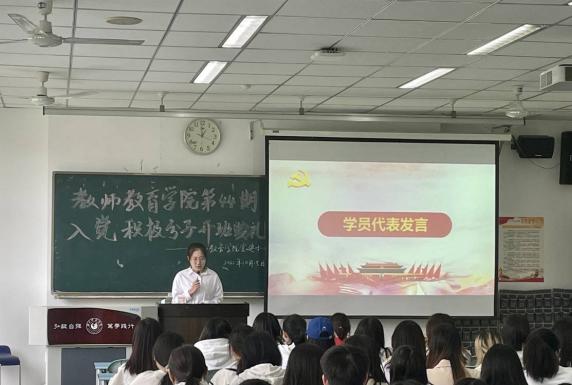 本次开班典礼共有三项议程,依次为全体奏唱国歌,学生代表发言,班主任杨婷婷讲党课。大会伊始,全体与会人员怀着敬畏、自豪之心奏唱国歌,拉开此次开班典礼的序幕。紧接着学生代表李颖进行发言,她代表全体学员表明了要以实际行动不断提升自己,积极参与各项活动,坚定向党组织靠拢的信心与决心。