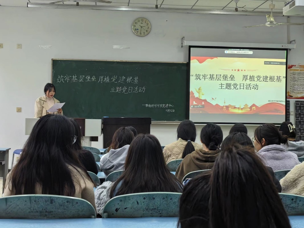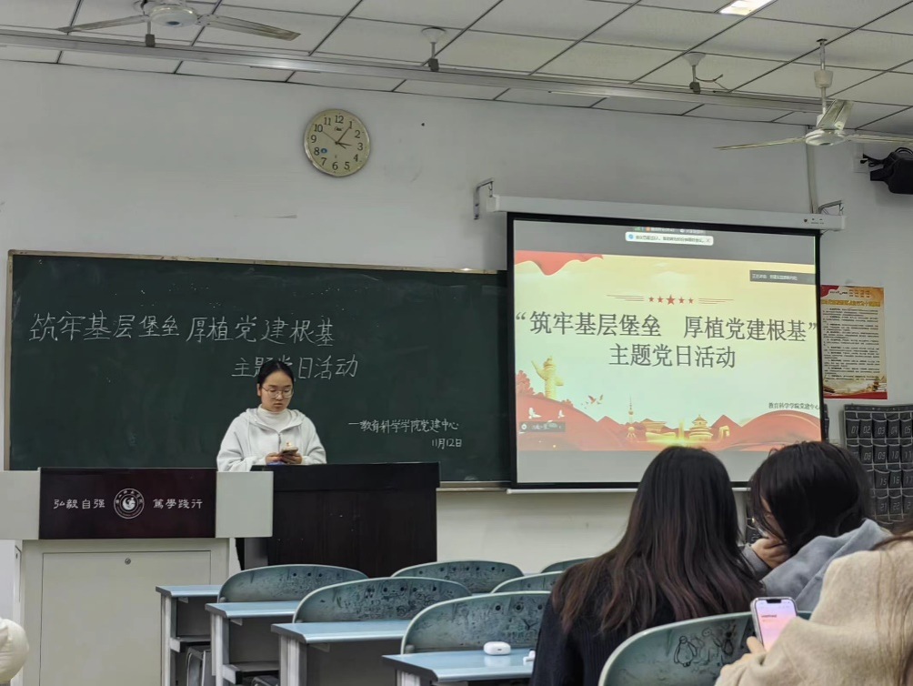 本网讯(文/陈侵源、图/郭纤纤)11月12日下午,教育科学学院组织学生党员开展了“筑牢基层堡垒,厚植党建根基”主题党日活动。此次活动由张晶主持。
