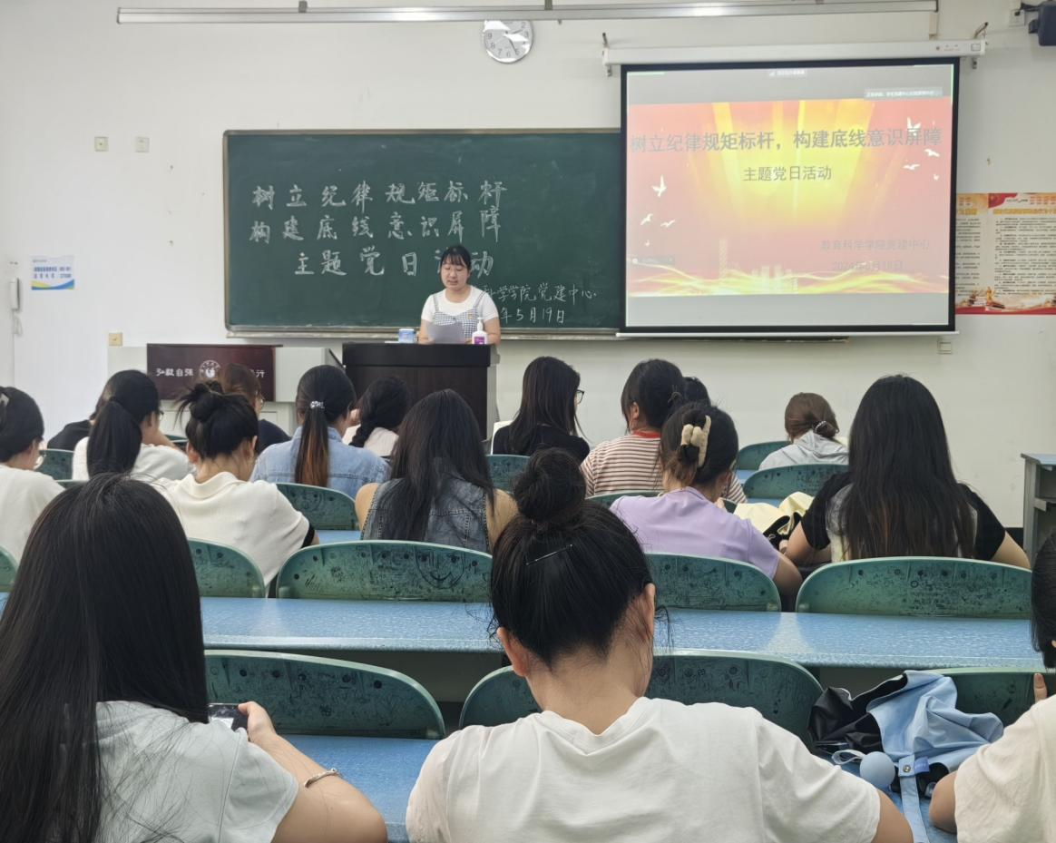 本网讯(文/陈侵源、图/张晶)5月19日下午,教育科学学院组织全体学生党员开展了“树立纪律规矩标杆,构建底线意识屏障”主题党日活动,此次活动由郭纤纤主持。