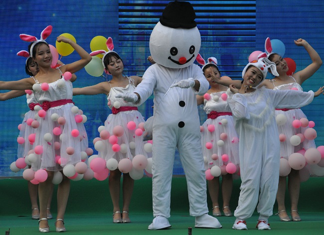 此次乐芽艺术团带来的是儿童剧的片段,以讲述儿童故事的方式引出,展现了兔宝宝与雪娃娃在来年冬天再次相逢后一同玩耍嬉戏的场景。演员们头戴毛绒绒的兔耳朵的头饰,身穿自己特制的满是气球的服饰,在舞台上生动地展现了兔宝宝的日常生活。为妈妈捶背,为妈妈洗脚,偶尔发脾气,偶尔睡懒觉……可爱的动作,漂亮的衣裳引得小朋友们不断发出赞叹的声音,小脑袋跟着音乐欢快地摇晃着,眼里放着喜悦的光芒。节目接近尾声时,“雪娃娃”上场了,他睁着圆圆的眼睛,挺着鼓鼓的大肚子,迈着笨重的步伐走向小朋友们,给他们送气球发糖果,和他们一同舞蹈,此场景将节目的气氛推向了高潮。音乐结束时,演员们放出了藏在自己身后的气球,气球随着风儿飘向天空,小朋友们欢笑的声音也在空中久久地回荡,好家风家规也留在了小朋友们的心中。