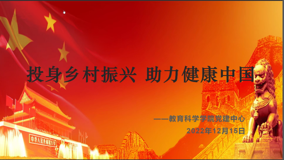 本网讯(文/杨焱、图/刘冬玉)为了帮助青年党员们更加了解乡村振兴战略,助力实现乡村振兴的发展,为乡村振兴保驾护航。12月15日下午,教育科学学院党建中心组织学院学生党支部党员以线上的形式,开展“投身乡村振兴,助力健康中国”主题党日活动。本次活动由邓庆琳主持。