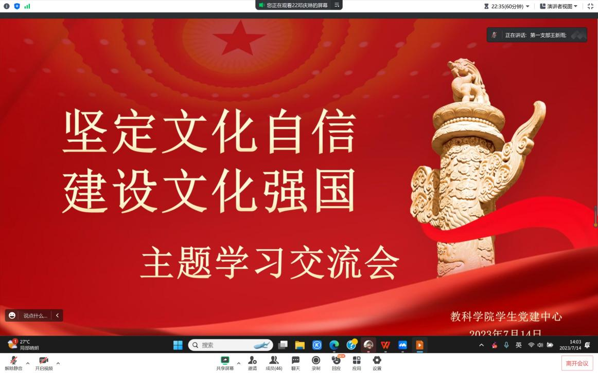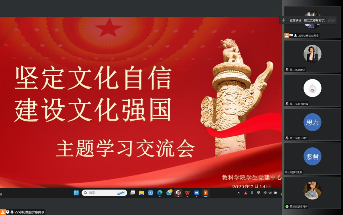本网讯(文、图/邓庆琳)为深入学习习近平总书记在文化传承发展座谈会上的重要讲话,让学生党员们在学习交流中坚定中华文化立场,厚植民族文化情怀,拓展世界文化视野,7月14日下午,教育科学学院以线上会议的形式组织全体学生党员开展了“坚定文化自信,建设文化强国”主题学习交流活动,此次活动由邓庆琳主持。