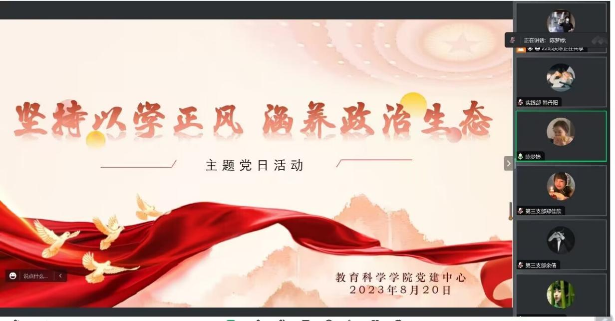 本网讯(文/邓庆琳、图/韩丹阳)8月24日下午,教育科学学院第一学生党支部组织全体党员开展了“坚持以学正风,涵养政治生态”主题党日活动,此次活动由邓庆琳主持。