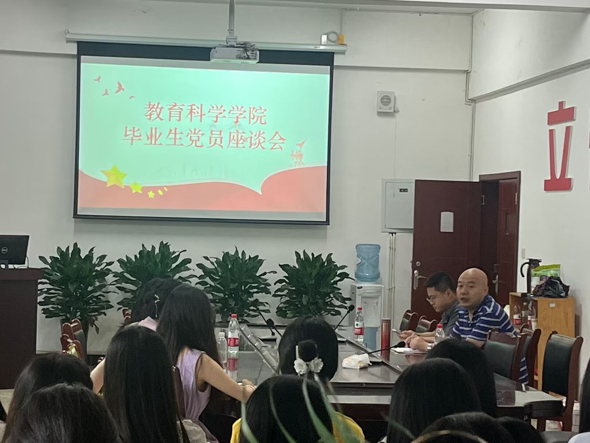 本网讯(文/魏一、图/付文颖)为引领毕业生党员的理想信念,弘扬教育正能量,6月18日上午,教育科学学院在学院会议室召开了毕业生党员座谈会,学院党委副书记、纪委书记何晓军、毕业班辅导员朱志刚参加。