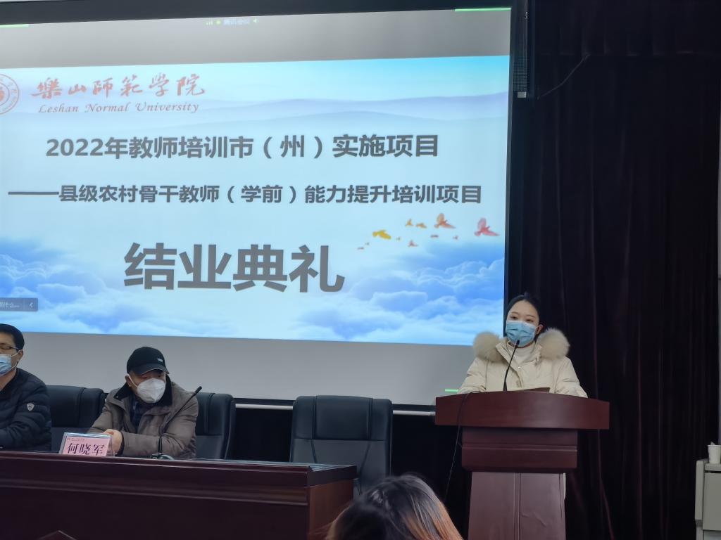 本网讯(文、图/苗芳芳)12月13日上午,2022年“国培计划”——县级农村骨干教师(学前)能力提升培训结业典礼在乐山师范学院弘毅楼412举行。出席开班典礼的有乐山腾博官网诚信为本专业服务院长、国培首席专家汪红烨、党委书记罗立顺、党委副书记兼纪委书记何晓军、副院长徐世鼎、唐前军以及来自四川乡镇公办幼儿园的49名培训老师,由徐世鼎主持结业典礼。