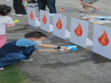情景表演:学前教育专业的哥哥姐姐们和来自幼儿园的张锦宸小朋友精心策划和表演了音乐情景剧《勇战恶龙》。家长和小朋友们围圈观看,一条“恶龙”出现,小朋友们惊呼不已,跟随剧情发展,家长小朋友们明白定点投掷和移动投掷的游戏规则。