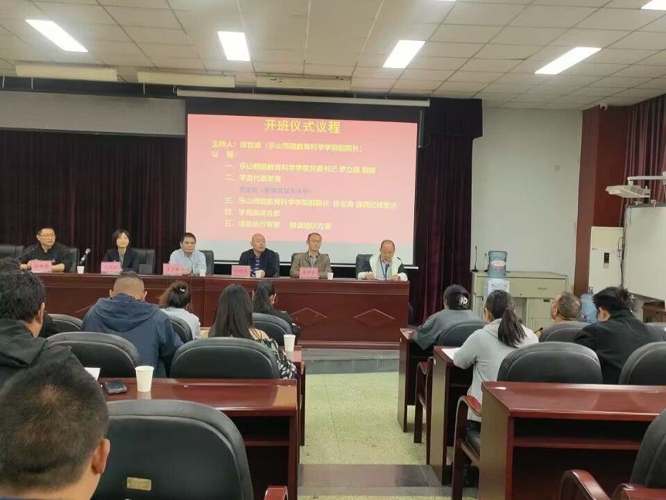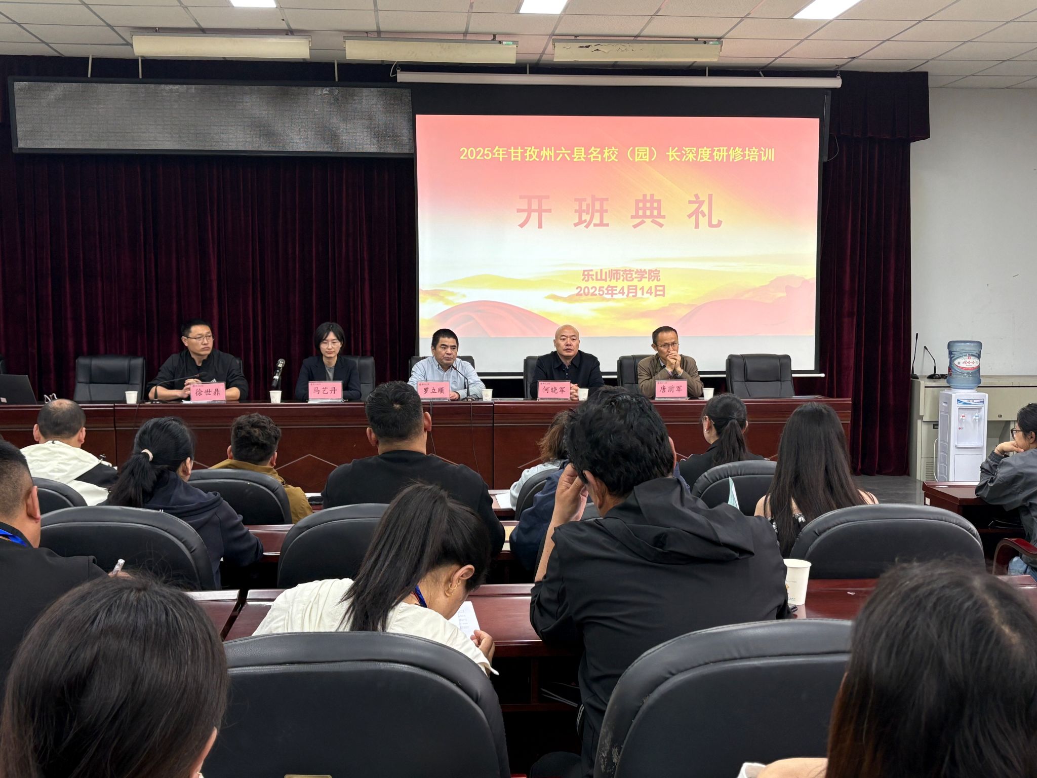 本网讯(文、图/杨斯淇、李飞宇)4月14日上午,由乐山腾博官网诚信为本专业服务承办的2025年国家及省级教师培训(甘孜州统筹项目)--县级名校(园)长深度研修培训开班仪式在弘毅楼412教室顺利举行。乐山腾博官网诚信为本专业服务党委书记罗立顺,党委副书记、 纪委书记何晓军,副院长唐前军、马艺丹,小学教育专业专任教师刘猛、教学与科研管理办公室教务干事钟小婷,党政办公室行政秘书陈佳以及来自甘孜州的36名学员参加了此次开班仪式;开班仪式由副院长徐世鼎主持。