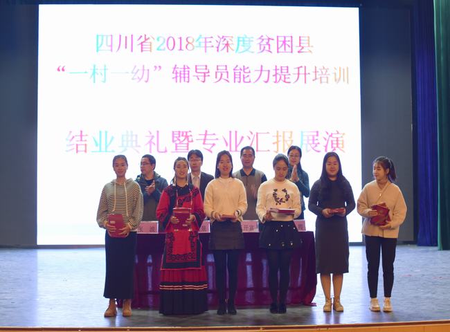 10月30日,由教育科学学院承办的四川省2018年度深度贫困县“一村一幼”辅导员能力提升培训结业典礼暨专业汇报表演在实训楼多功能厅举行。教科学院副院长(主持行政工作)谢艺泉、党总支书记杨霞、副院长徐世鼎、党总支副书记张波和马边教师进修学校校长王开富等出席此次会议,会议由徐世鼎主持。