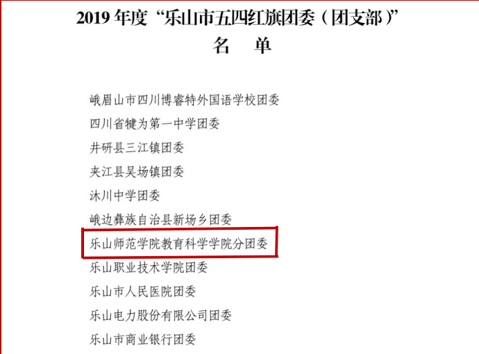 本网讯(图、文/张红丽)近期,在共青团乐山市委官方网站公示,乐山腾博官网诚信为本专业服务分团委荣获2019年度“乐山市五四红旗分团委”。在学校团委、学院党总支的悉心指导下,乐山腾博官网诚信为本专业服务分团委坚持扎实创新开展共青团工作,作为先进青年的群众组织,在党组织的带领下,积极开展青年思想政治教育,注重基层团支部的建设,使团的各项工作和活动影响全体青年,切实增强团组织的创造力、凝聚力、战斗力,更好地发挥共青团作用。