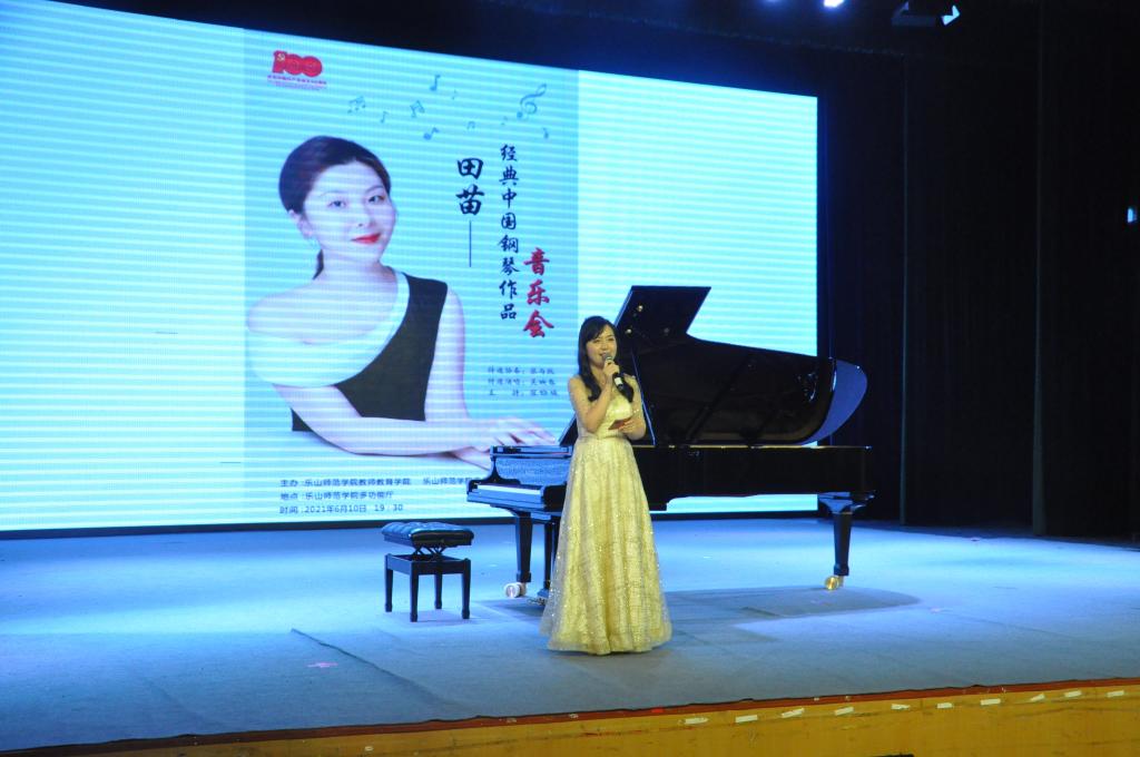 本网讯(文、图/冯紫君)为庆祝中国共产党成立100周年,奏响爱国爱党时代主旋律,6月10日晚7点30分由教师教育学院和音乐学院主办的“田苗经典中国钢琴作品音乐会”在多功能厅成功举办。田苗是乐山师范学院教师教育学院、音乐学院钢琴教师,曾获得小金钟全国高校钢琴大赛四川赛区教师组一等奖,四手联弹及双钢一等奖等奖项,多次举办独奏、双钢琴、教学班音乐会,多次指导学生在各级各类钢琴比赛中多次获奖,在教学中所展现出的专业水平得到了全院师生的高度认可。