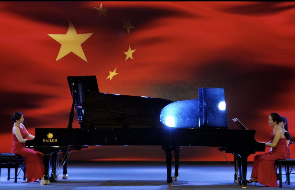 双钢演奏《黄河颂》、《黄河愤》和《红旗颂》将本场音乐会推向了最高潮。《黄河颂》、《黄河愤》在创作中运用了西洋古典钢琴协奏曲的表现手法,技巧华丽,层次丰富,意境壮阔。黄河滚滚涌新潮,红歌声声颂党恩。《红旗颂》采用了主题贯穿发展的奏鸣曲式结构。该曲的第一部分舒展豪迈;第二部分深情委婉;展开部跌宕起伏;再现部国歌动机的加入高度概括了整部作品的颂歌主题。最后,田苗和张与弛带来返场曲目四手联弹《肖斯塔科维奇第二圆舞曲》让现场听众意犹未尽。