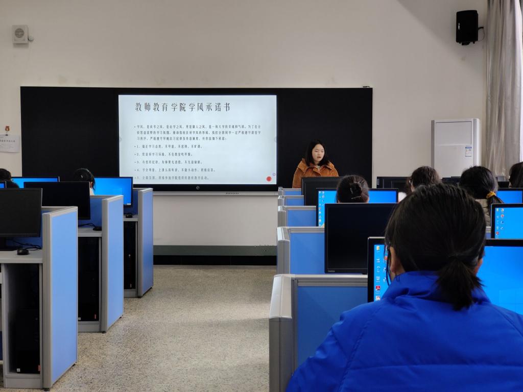 课前十分钟,任课老师面向全体学生进行师德承诺,铿锵有力的誓言展现出教师严谨治学、以身作则的良好师风。同学们在各班委的带领下,全体起立,精神抖擞地作出庄严承诺:“端正学习态度,不早退,不迟到,不旷课,营造好学习环境,有组织纪律,学会尊重,上课认真听讲…”同学们纷纷表示:今后要自觉践行该项承诺,将学风建设的承诺真正落到实处,努力学习,学有所成,学有所获。