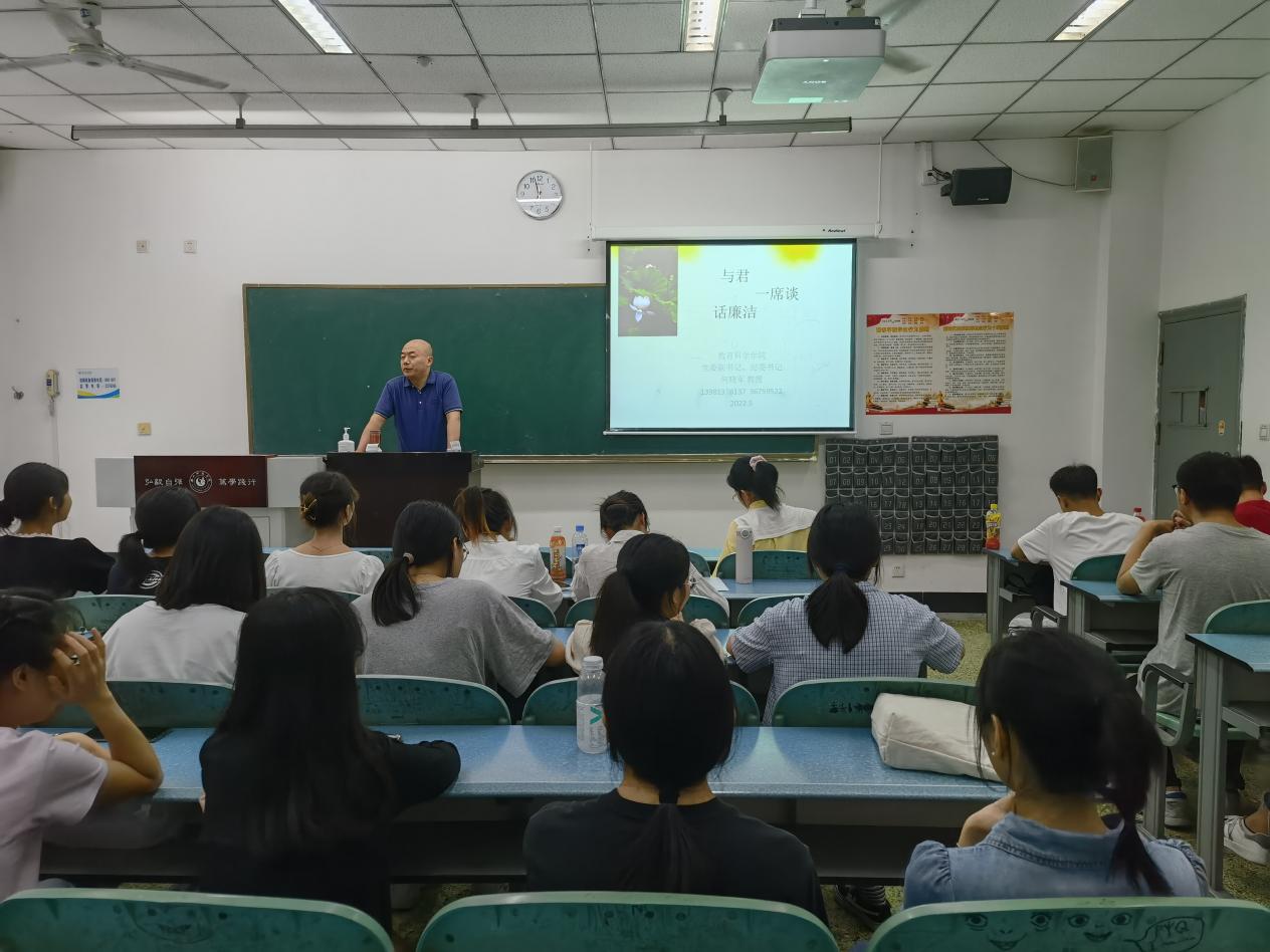 本网讯(文/冯紫君、图/杨蕾)为加强对毕业生的思想引领,进一步增强毕业生廉洁自律意识,5月5日,教育科学学院于行知楼122教室召开了题为“与君一席谈——话廉洁”的廉洁教育讲座。本次讲座由教育科学学院党委副书记、纪委书记何晓军主讲,毕业班辅导员和2022届毕业班学生代表到场聆听。