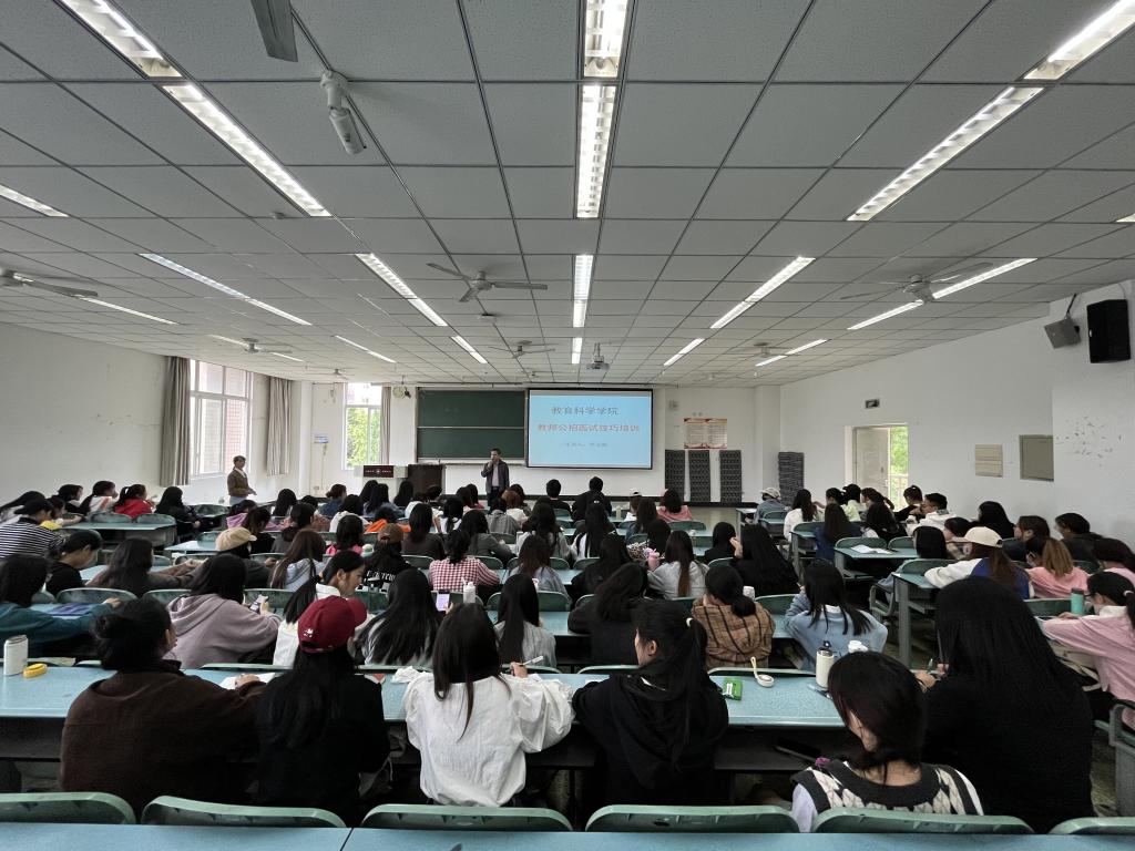 本网讯(文、图/廖羽灿、朱志刚)为契合学生发展需求,助力2023届学前专业毕业生备战教师公招考试,增强就业竞争力。5月18日下午,教育科学学院于行知楼201教室举行教师公招考试培训讲座。讲座由学院党委书记罗立顺主持,2023届学前教育专业学生参加此次培训。