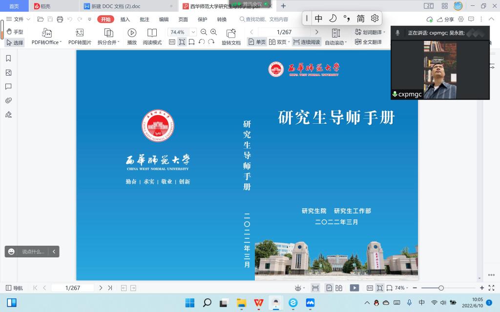 本网讯(文、图/胡天慧)2022年6月10日,本着以人为本的科学发展观和我校2022年度人才工作会议的重要精神,根据西华师范大学研究生院和我校研究生导师管理部门的具体要求,结合现阶段疫情防控的现实需要,教育科学学院通过腾讯会议的方式对唐前军、陈谢平、马艺丹、吴永胜等四位新晋的西华师范大学兼职硕士生导师进行了专题培训。