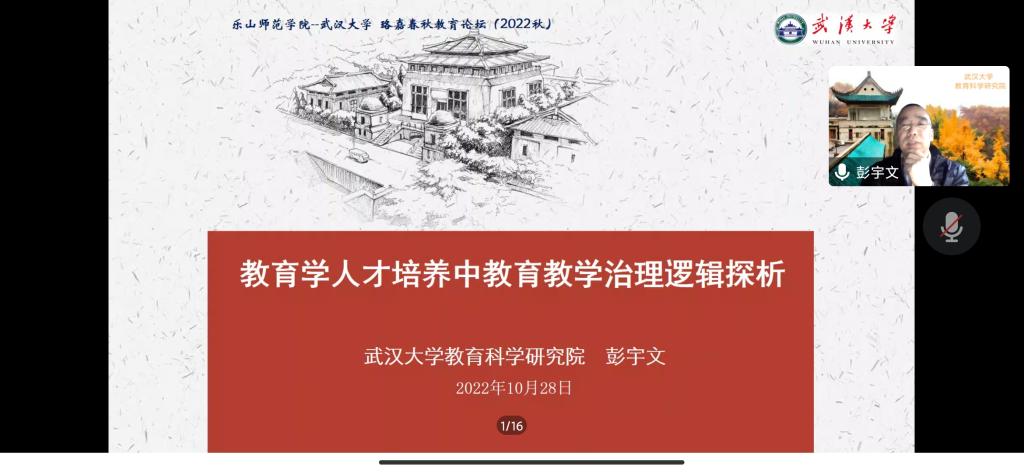 本网讯(文、图/巴玉宁)为促进双方学者交流合作、提供学术探讨、了解前沿研究领域,10月28日上午,由武汉大学、乐山师范学院主办,武汉大学教育科学研究院和乐山腾博官网诚信为本专业服务联合承办的珞嘉春秋教育论坛(2022年秋)以“线上+线下”相结合的形式,在武汉大学教育科学研究院报告厅和乐山师范学院行知楼513智慧教室成功举办。此次论坛共四个阶段,依次为论坛开幕式、专题报告、春秋教育论坛、论坛总结,各专家学者就“多元协同视域下教育学类人才培养模式改革”为主题进行了交流和探讨。