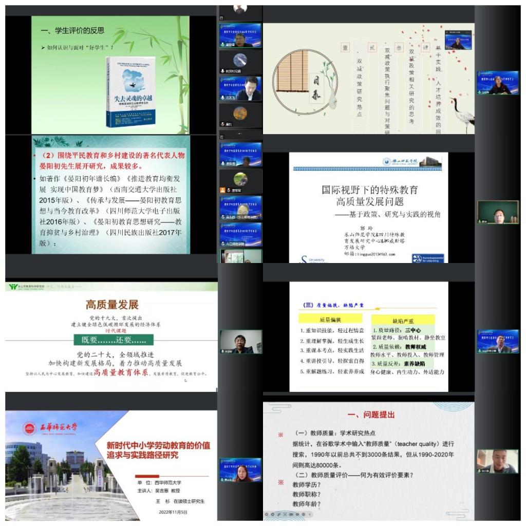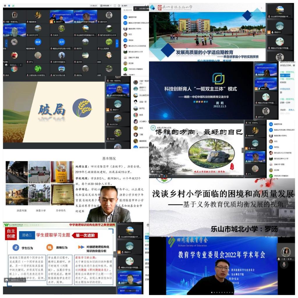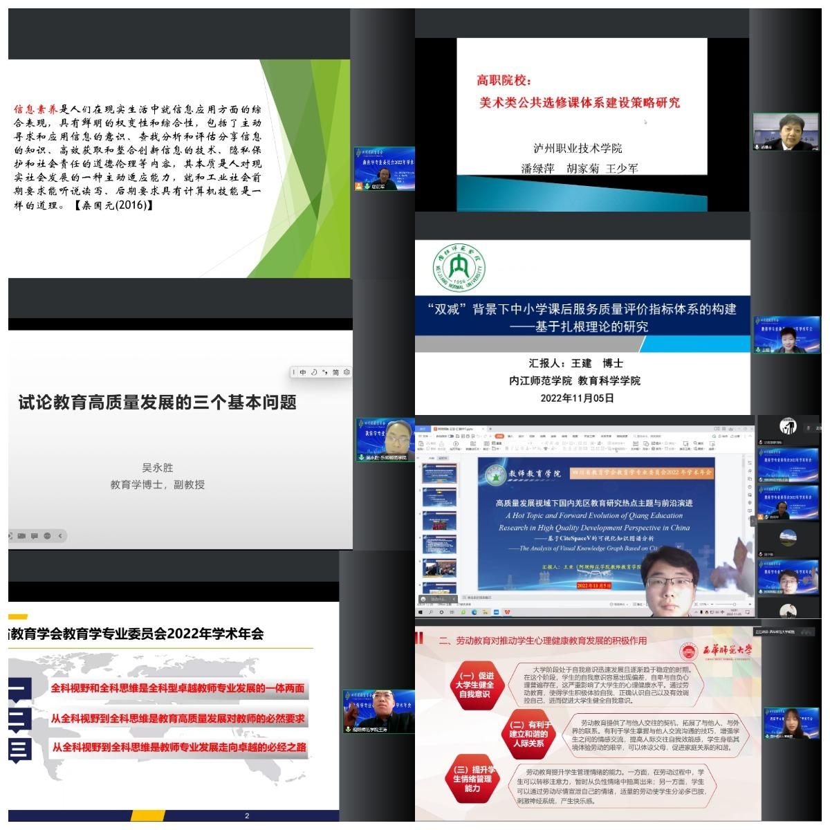 本网讯(文、图/朱志刚、刘玉凤、巴玉宁)11月5日,四川省教育学会教育学专业委员会2022年学术年会“深化新时代教育评价改革与基础教育高质量发展”在“云端”隆重召开。本次年会由四川省教育学会教育学专业委员会主办,乐山师范学院、四川乡村教育发展研究中心、“农村教育的历史发展与当代改革研究”四川省社会科学高水平研究团队承办。四川省教育学会教育学专委会理事长、副理事长、常务理事、理事、部分教育学会会员,省内高校、研究机构的教师和研究生代表,部分地市州教育局、教科所、中小学、幼儿园的领导和教师以及乐山师范学院师生260余人参加了线上会议。
