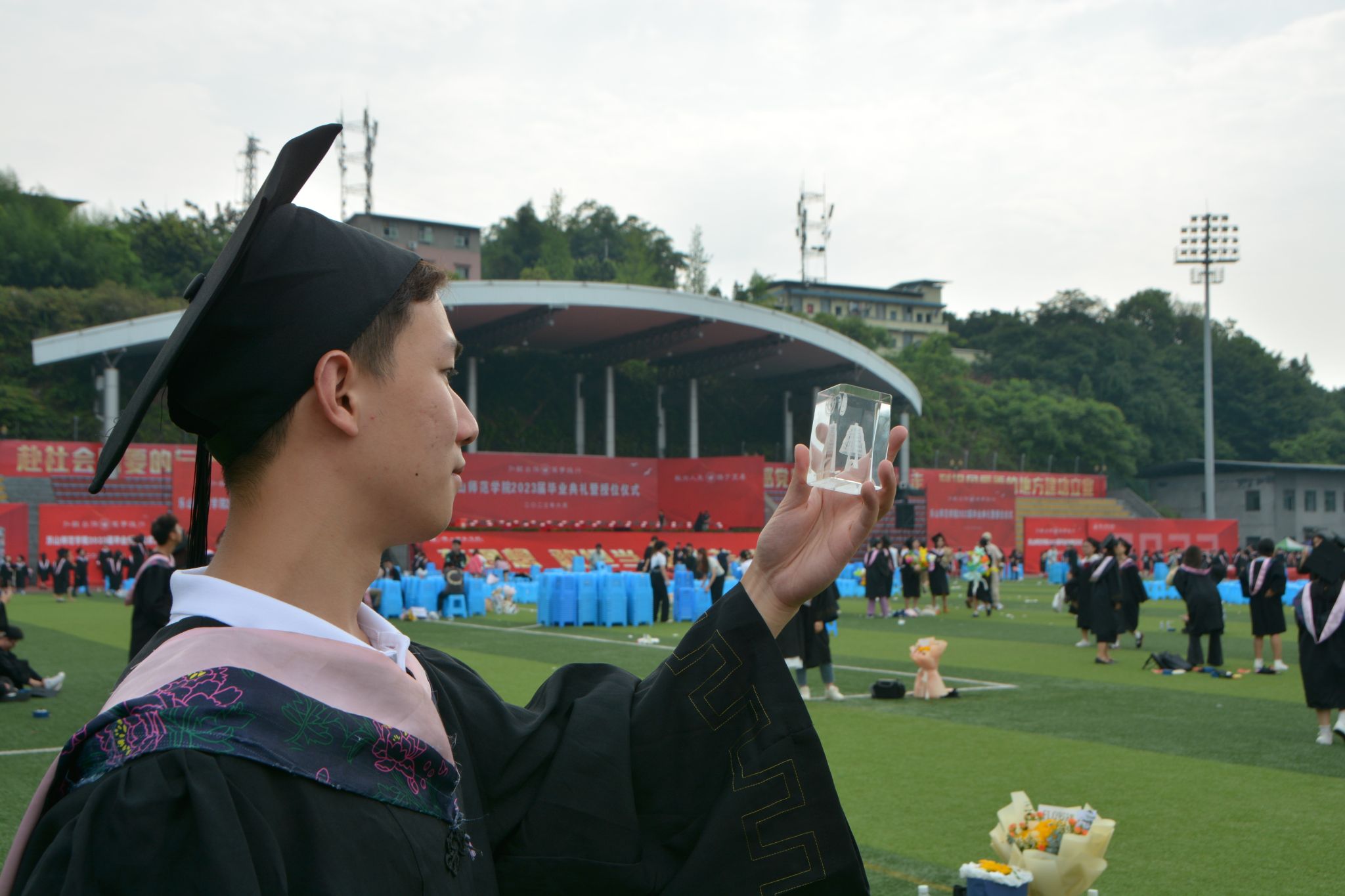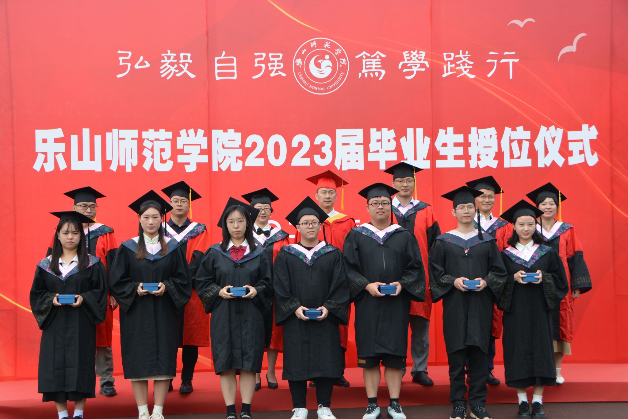 授位仪式开始,头戴学位帽、身着学位服的毕业生们怀着激动的心情依次上台,导师们为同学们拨穗正冠,与他们合影留念,并代表学院向毕业生赠予了毕业留念礼品。2023届毕业留念采用水晶制作,寓意“纯洁、典雅和坚持”,内嵌“木铎”,取自《论语.八佾》“……天以夫子为木铎”。木铎一面刻篆书“乐师”,一面刻“教科”,衬以校徽。盒子外印烫金教科理念和《荀子·修身》“道虽迩,不行不至;事虽小,不为不成”。希望走出校园的毕业生们身怀教育理想,有德、有为、有乐,让祖国的未来遇见一生的“好老师”。