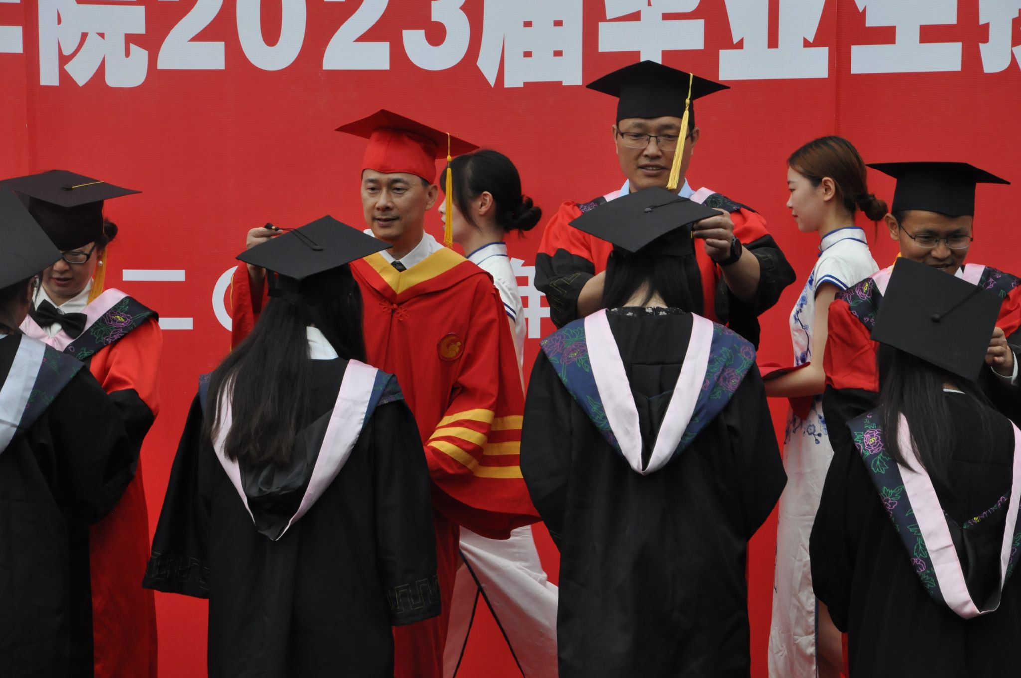 本网讯(文、图/朱志刚)6月13日,教育科学学院在北校区田径场举行了2023届毕业生授位仪式,学校党委常委、副校长汪天飞教授,教科学院院长汪红烨教授、副院长徐世鼎副教授、副院长唐前军教授,学术委员王立新教授、吴永胜博士、金春燕博士等七位导师为毕业生们拨穗授位。