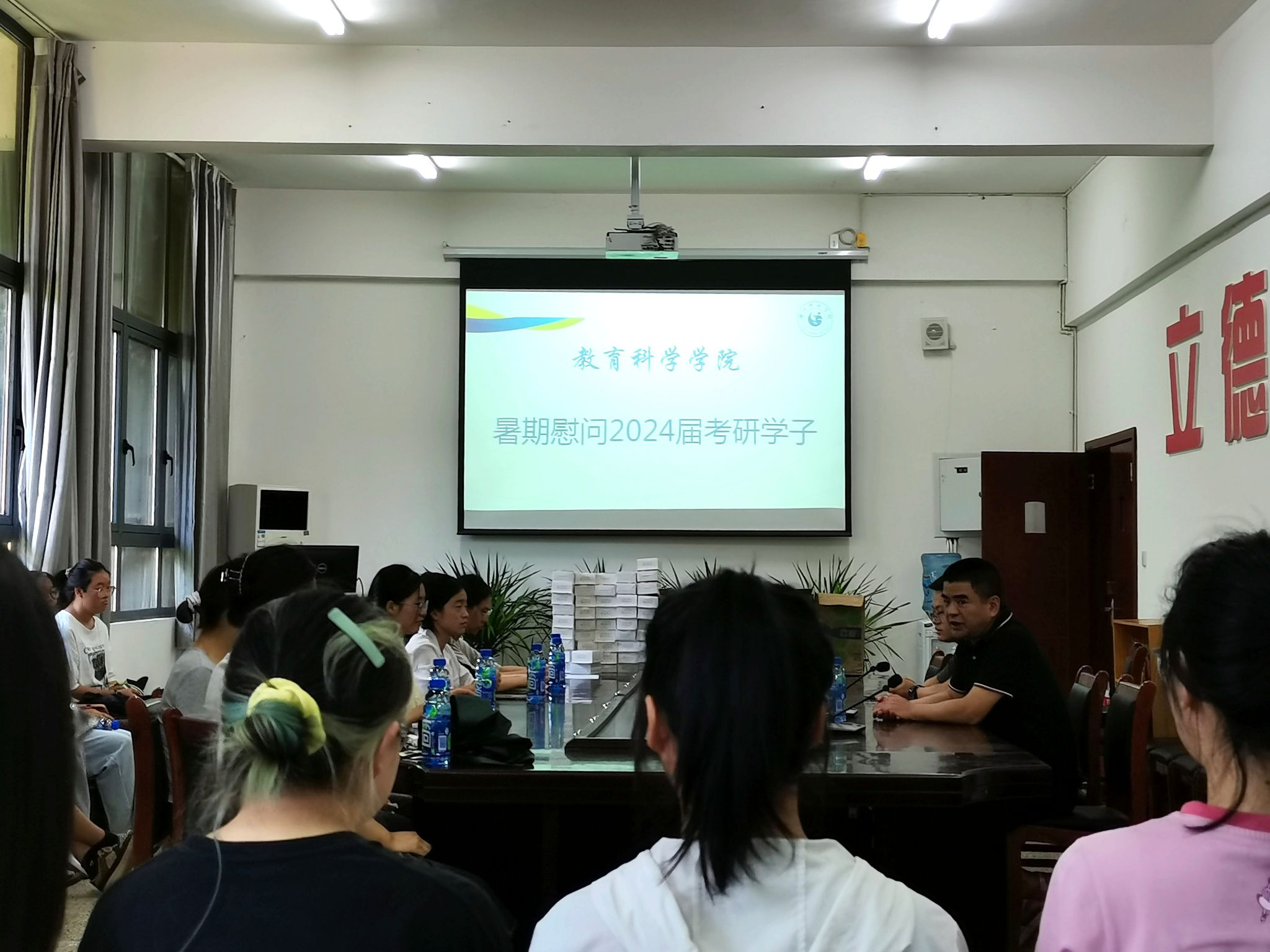 本网讯(文、图/余倩)8月10日上午,教育科学学院党委书记罗立顺、辅导员朱志刚在学院会议室与四十多名暑期留校学生座谈,关心、慰问考研学子的暑期学习状况。