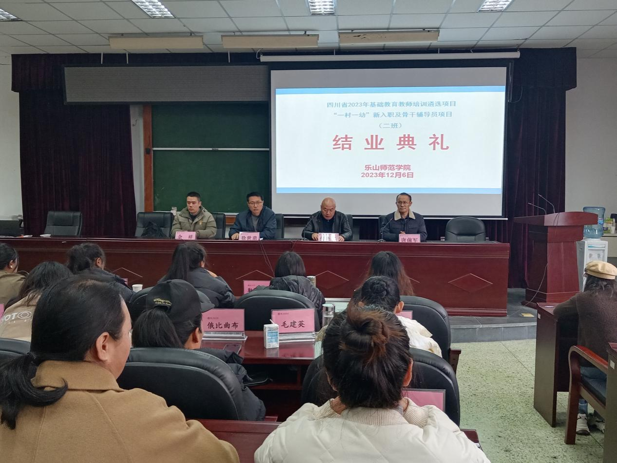 本网讯(文、图/陈欢)12月6日上午,由乐山腾博官网诚信为本专业服务承办的四川省2023年基础教育教师培训遴选项目——“一村一幼”新入职及骨干辅导员项目(二班)圆满结束并顺利举行结业典礼。乐山腾博官网诚信为本专业服务党委副书记兼纪委书记何晓军、副院长徐世鼎、学前教育系主任余祥、生活班主任帅希权和来自凉山州的46名骨干辅导员参加了结业典礼。结业典礼由副院长唐前军主持。
