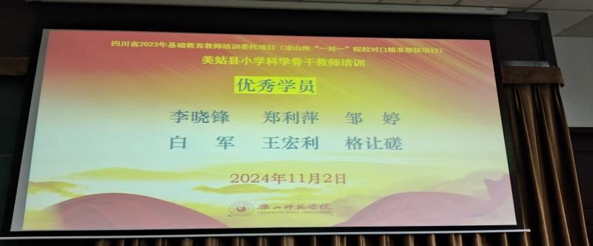 (本讯网文、图/杨珊珊)11月1日,美姑县小学科学骨干教师培训结业典礼在弘毅楼312教室举行。教育科学学院党委书记罗立顺,副院长唐前军,党政办主任杨林,教师教育教研室主任张广云出席本次典礼。典礼由教育科学学院副院长唐前军主持。