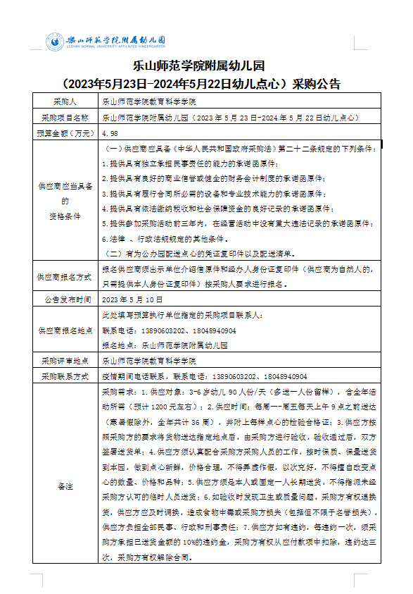 乐山师范学院附属幼儿园(2023年5月23日-2024年5月22日幼儿点心)采购公告