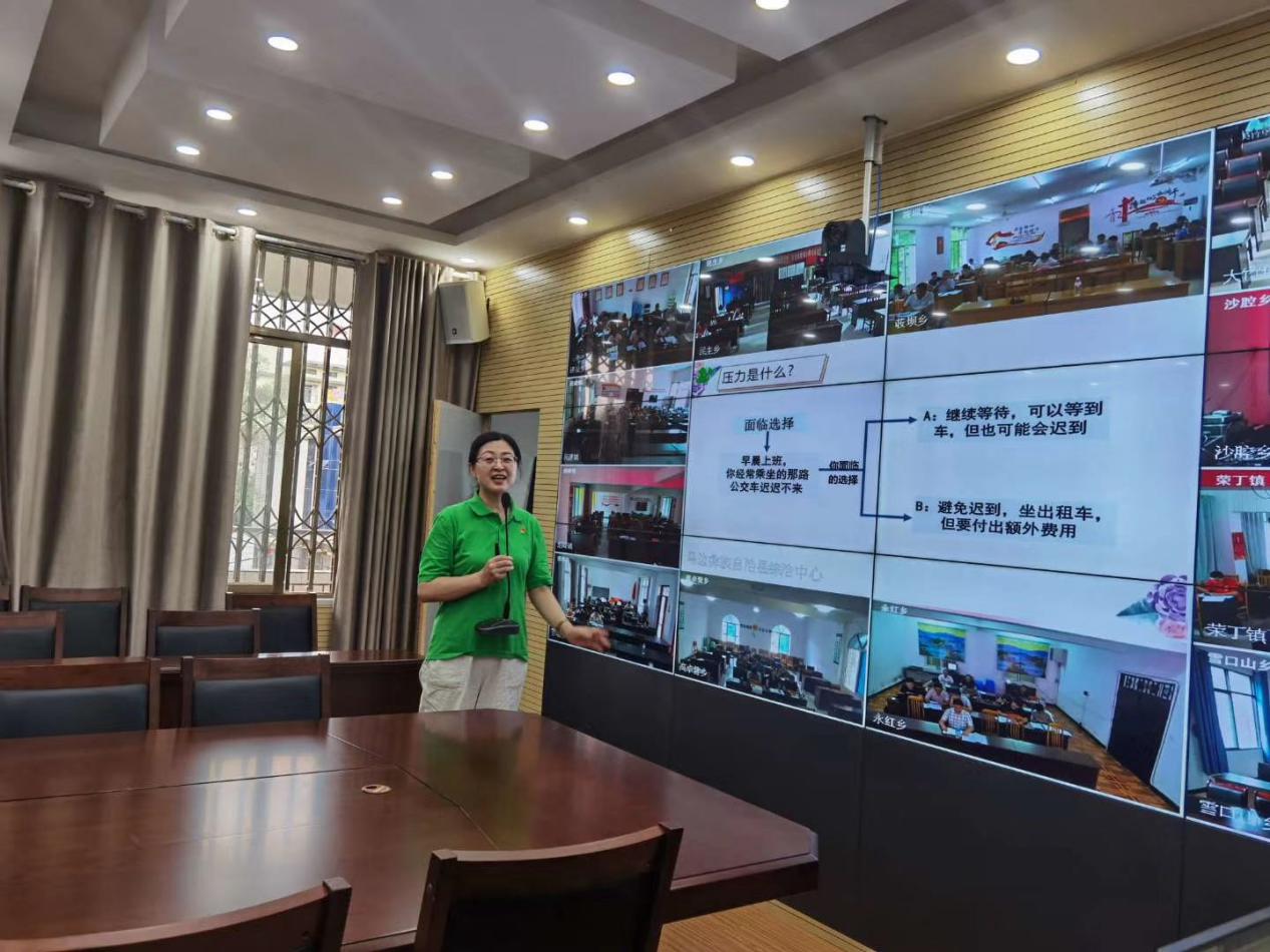 此次辅导是马边彝族自治县第一书记暨驻村工作队队员重点培训班的重要内容之一,采用电视电话会议的形式进行,分为主会场和15个分会场,共辐射15个乡镇,总计300余名驻村干部参加。杨霞老师以《压力小,睡得好》为主题开展了如何从容应对压力,破解失眠误区的讲授,并现场指导如何采用腹式呼吸放松和想象放松来缓解压力和快速入眠,取得了良好效果。邓雪薇老师以《我的情绪我做主》为主题告诉大家面对压力,有情绪困扰时如何改变想法来改变情绪。