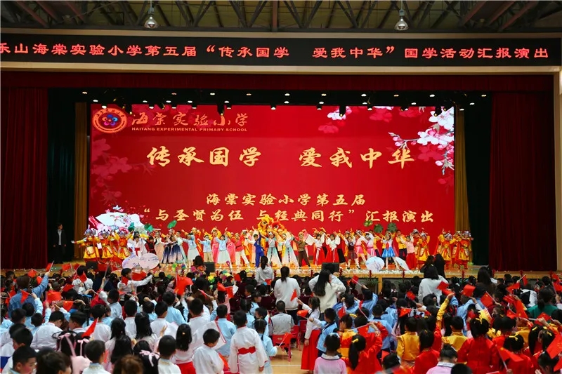 经过了足足一月的紧张筹备和辛苦排练,海棠实验小学西校区第五届“传承国学,爱我中华”汇报演出于2020年10月30日下午在体育馆隆重举行,活动分为四个部分,分别是:“启,国学风采”、“品,盛世文明”、“追,国学怀”、“承,千年精髓”。在海棠的廊亭内,木椅旁,扶栏上……无处不是“国学”的身影,环境、课程和活动的“三结合”,让海棠娃的“民族根”牢牢扎进沃土中。