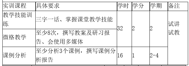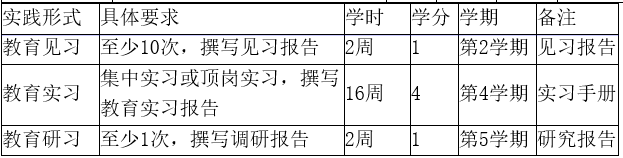 校外实践包括教育见习、教育实习、教育研习。实践教学时间原则上不少于1学年,其中校外集中实践不少于1学期。教育见习1学分,第2学期完成,包括观摩教育教学活动、听课、旁听教研活动,各类活动总数不少于10次。教育实习4学分,第4学期完成,包括试讲、教研、讲课、学生管理、课题研究等活动,各类活动总数不少于40次。教育研习1学分,贯穿实践教学全过程,第5学期撰写1份不少于3000字的教育研习报告,由导师进行考核评价。