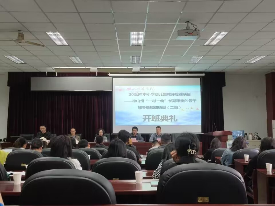 本网讯(文、廖天会/图、何琳琳)4月3日上午,由乐山腾博官网诚信为本专业服务承办的四川省2023年中小学幼儿园教师培训市(州)实施项目——凉山州“一村一幼”长期稳定的骨干辅导员培训项目(2班)开班典礼在弘毅楼412教室顺利举行。乐山腾博官网诚信为本专业服务院长、国培项目首席专家汪红烨、党委书记罗立顺、副院长徐世鼎、副院长唐前军、学前教育系主任余祥和来自凉山州的50名骨干辅导员参加了此次开班典礼,典礼由徐世鼎主持。