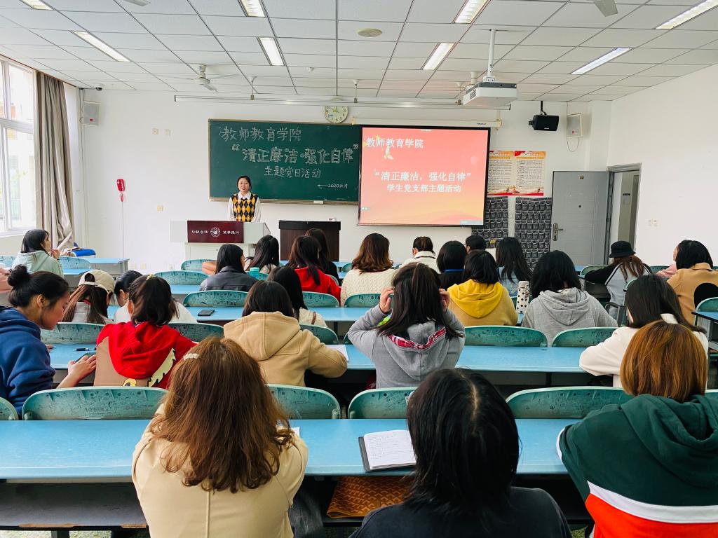 本网讯(图、文/常燕林)为贯彻党的十九大精神及习近平新时代中国特色社会主义思想,强化学生党员政治担当,增强“讲政治、业务精、作风好”的党员干部意识,教师教育学院学生党支部于10月17日上午10:00,在行知楼206教室开展“学四史,清正廉洁,强化自律”主题党日活动,全体学生党员参加活动,会议由王淇主持。