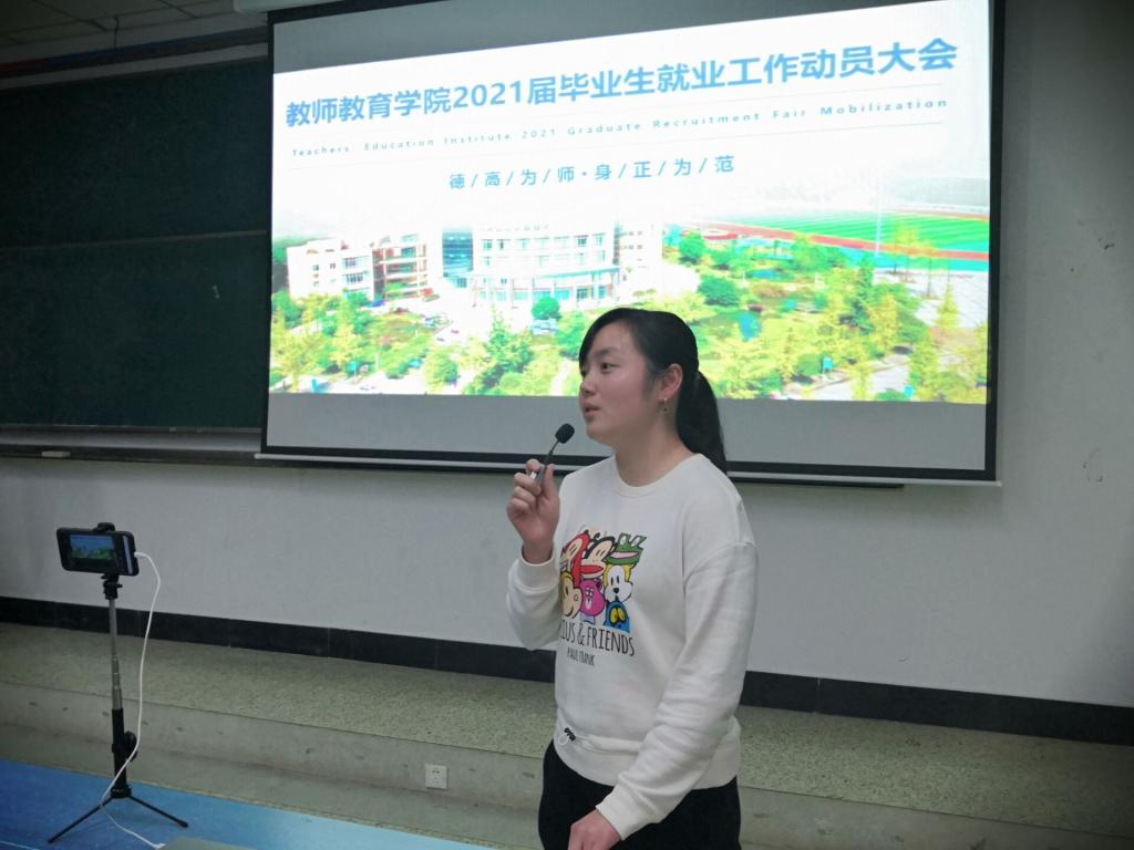 本网讯(图、文/冯紫君)为进一步做好毕业生就业工作,加强对学生就业的指导,11月17日晚七点,教师教育学院在行知楼325教室召开了2021届毕业生就业工作动员大会。教师教育学院学生科长翟雅媛、17级辅导员袁立方及17级部分同学参加此次会议。
