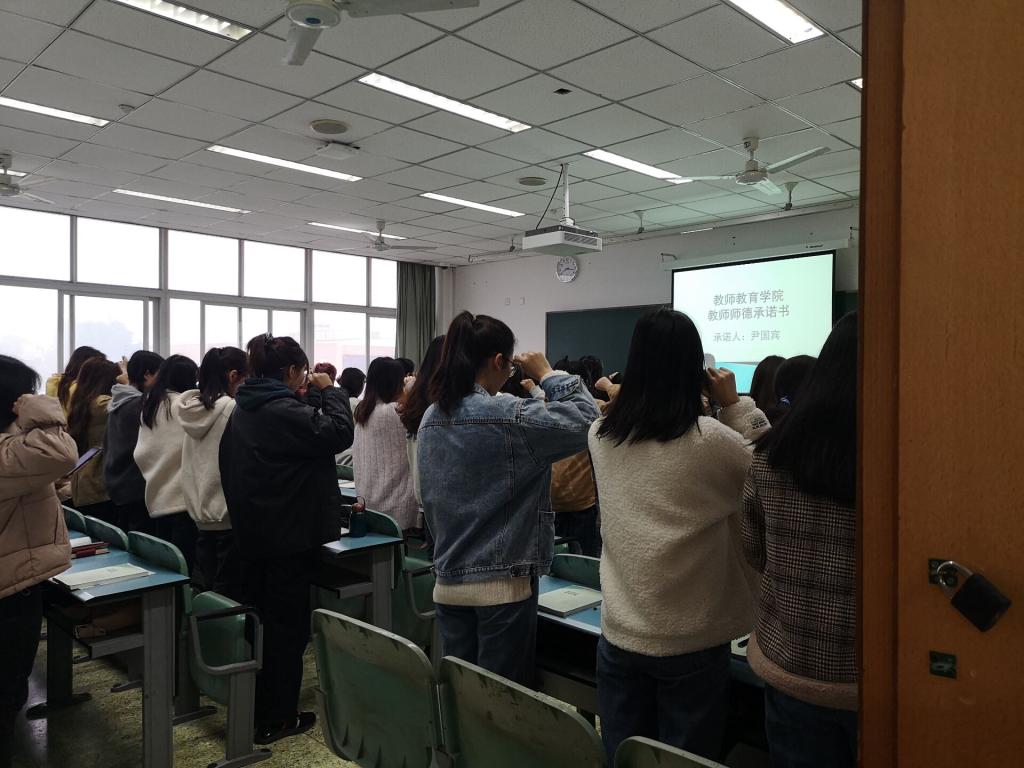 课前十分钟,任课老师们面向全体学生进行师德承诺,铿锵有力的誓言展现出教师严谨治学、以身作则的良好师风。同学们在各班委的带领下,庄严承诺:“严格遵守课堂纪律,上课不迟到、不早退、不旷课,不使用通讯工具,认真听讲,积极发言,不高声喧哗、不起哄、不睡觉、不做任何与学习无关的事……”学高为师,身正为范。教师以立德树人为根本,甘为平凡,无悔奉献,言传身教,教书育人。