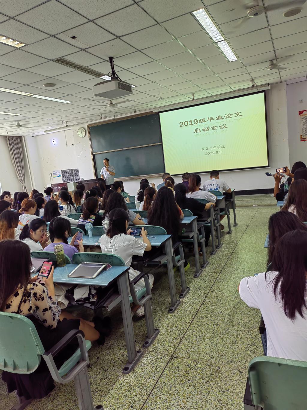 本网讯(文、图/邓琳)为保证我院毕业论文教学质量,推动2019级毕业论文工作的顺利开展,2022年6月9日下午13:00,教育科学学院在行知楼125教室举行了2019级本科毕业论文启动会议。全体毕业论文指导老师和我院全体学生参加了启动会,会议由唐前军副院长主持。
