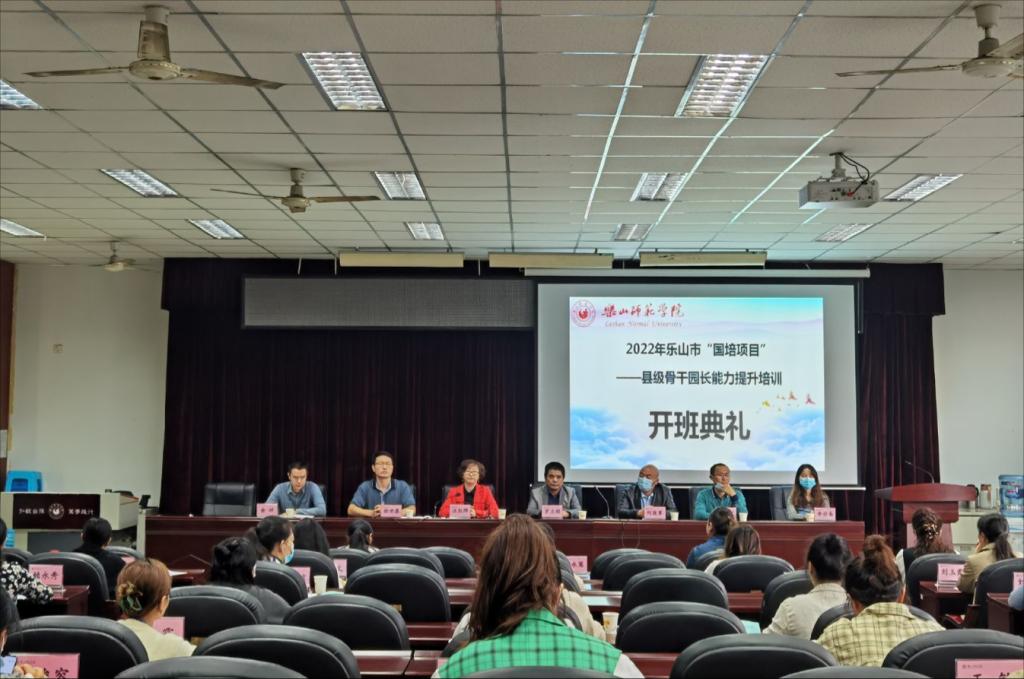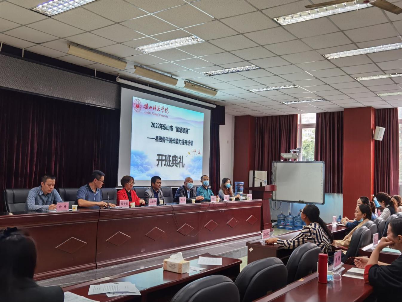 本网讯(文、图/詹海霞)10月22日上午,由乐山腾博官网诚信为本专业服务承办的“国培计划(2022)—县级骨干园长能力提升培训”开班典礼在弘毅楼412教室顺利举行。乐山腾博官网诚信为本专业服务院长、国培项目首席专家汪红烨、党委书记罗立顺、党委副书记兼纪委书记何晓军、副院长徐世鼎、副院长唐前军、学前教育系主任余祥、学前教育系副主任李非易和来自乐山市的40名非乡村振兴重点县乡镇公办园园长,参加了此次开班典礼,此次典礼由徐世鼎主持。