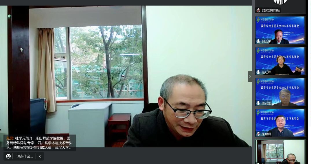 本网讯(文、图/朱志刚、刘玉凤、巴玉宁)11月5日,四川省教育学会教育学专业委员会2022年学术年会“深化新时代教育评价改革与基础教育高质量发展”在“云端”隆重召开。本次年会由四川省教育学会教育学专业委员会主办,乐山师范学院、四川乡村教育发展研究中心、“农村教育的历史发展与当代改革研究”四川省社会科学高水平研究团队承办。四川省教育学会教育学专委会理事长、副理事长、常务理事、理事、部分教育学会会员,省内高校、研究机构的教师和研究生代表,部分地市州教育局、教科所、中小学、幼儿园的领导和教师以及乐山师范学院师生260余人参加了线上会议。