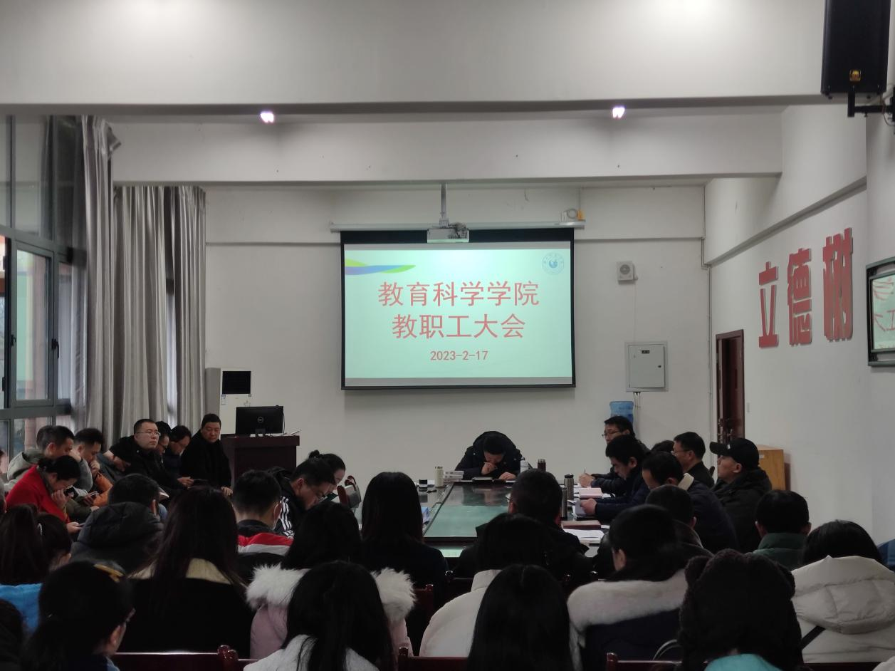 本网讯(文、图/巴玉宁)2月17日,教育科学学院在特教大楼B栋101会议室召开新学期教职工大会,电子信息与人工智能学院党委书记蒋强、教育科学学院领导班子成员以及全体教职工参加此次会议。
