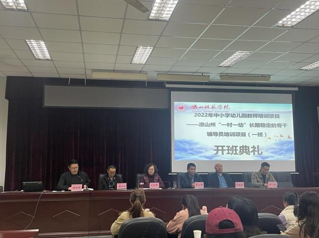 本网讯(文、罗佳/图、任睿)3月20日上午,由乐山腾博官网诚信为本专业服务承办的“四川省2022年中小学幼儿园教师培训市(州)实施项目——凉山州‘一村一幼’ ”开班典礼在弘毅楼412教室顺利举行。乐山腾博官网诚信为本专业服务院长、国培项目首席专家汪红烨、党委书记罗立顺、党委副书记兼纪委书记何晓军、副院长徐世鼎、副院长唐前军、学前教育系主任余祥和来自凉山州的50名骨干辅导员参加了此次开班典礼,典礼由徐世鼎主持。