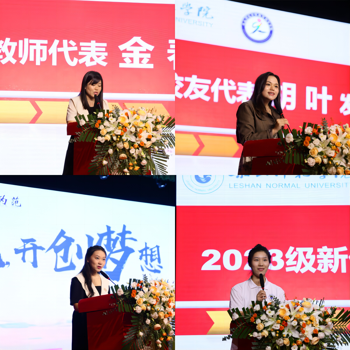开学典礼还邀请了优秀校友代表2018级小学教育学生胡叶发言,她向学弟学妹们分享了大学期间厚积薄发、踏实奋进的个人经验,同时对母校、老师们表达了真切的问候与祝福。随后高年级学生代表2021级刘芳发言,向新生们分享了自己的学习经验以及所见、所感、所悟,强调生活、学习都要有规划,要找到适合自己的学习方法,多参与社会实践活动,实现德智体美劳全方面发展。最后,新生代表2023级程曦代表全体新生发言,畅谈了对大学生活的向往,希望能在乐师追寻和实现自己的梦想,表示将会勤奋刻苦、努力拼搏,不辜负老师和父母的期望。发言之后全体新生宣誓,秉承院训:教善求真,躬行致知。